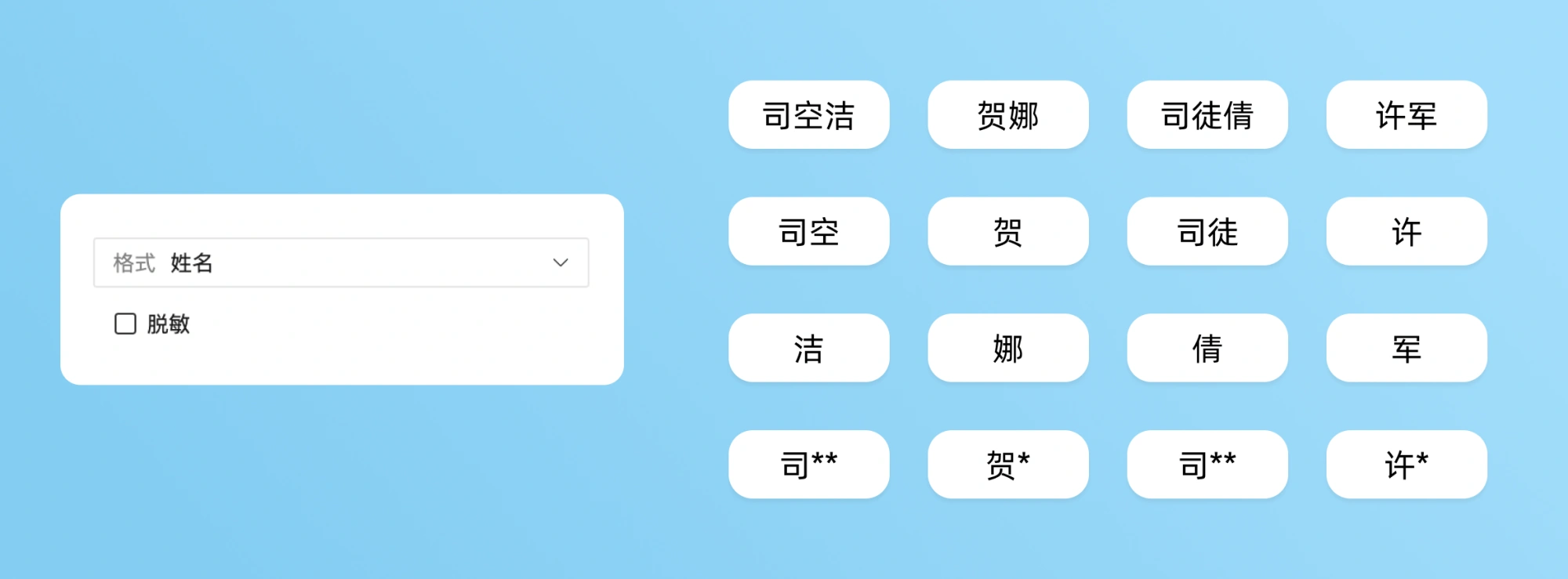 姓名格式支持:姓、名、全名,并提供姓名脱敏选项。